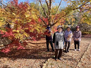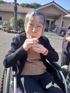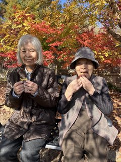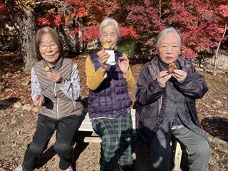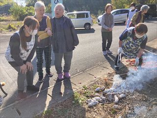 先日の芋掘りで収穫したお芋を、秋色に染まった庭で焼いもにしました♪赤や黄色の葉っぱがきらきら光り、皆さん「きれぇなぁ」と笑顔がこぼれます。焼き上がる香りに「まだかいな?」と笑い声も♪