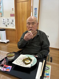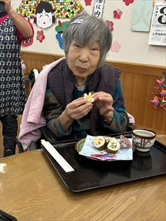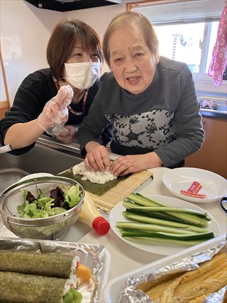 その後は、スタッフと一緒に恵方巻づくり。手作りの恵方巻は、いつも以上においしく感じられたようです♪