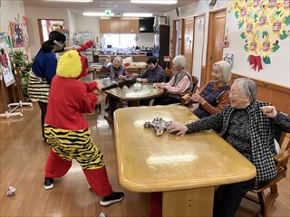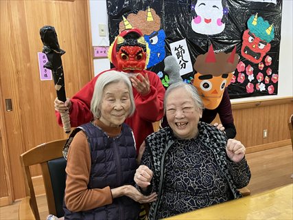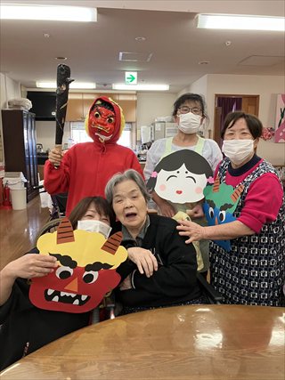 鬼に扮したスタッフが登場すると、最初はびっくりしながらも、入居者さんの笑顔がこぼれます。