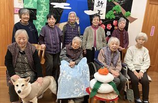 倉敷市真備町にある認知症対応型共同生活介護「グループホームまきびの丘」です!新年を迎え、お正月飾りの前で皆さんそろって記念撮影を行いました!「一年の計は元旦にあり」と言いますが、笑顔で写真に写ることが何よりの良いスタート♪撮影のあとは大きな福笑いに挑戦し、「そこそ…
