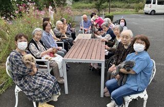 倉敷市真備町にある認知症対応型共同生活介護「グループホームまきびの丘」です!今日は月に一度の「セラピー犬」の日ですが、なんとホームのハナコも入れて5匹のわんこが大集合!気候も良くなってきたので、外で触れ合いを楽しみます♪いつもと違う雰囲気に、わんちゃんも入居者の皆さんもテ…