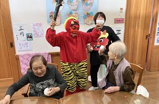 倉敷市真備町にある認知症対応型共同生活介護「グループホームまきびの丘」です!今日は節分行事を楽しみました♪鬼に扮したスタッフが登場すると、最初はびっくりしながらも、入居者さんの笑顔がこぼれます。新聞紙を丸めた“豆”を「えいっ!」と投げると、笑い声があちこちから聞こえてきま…